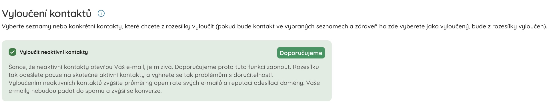 Funkci vyloučení neaktivních kontaktů doporučujeme používat u běžných marketingových rozesílek.