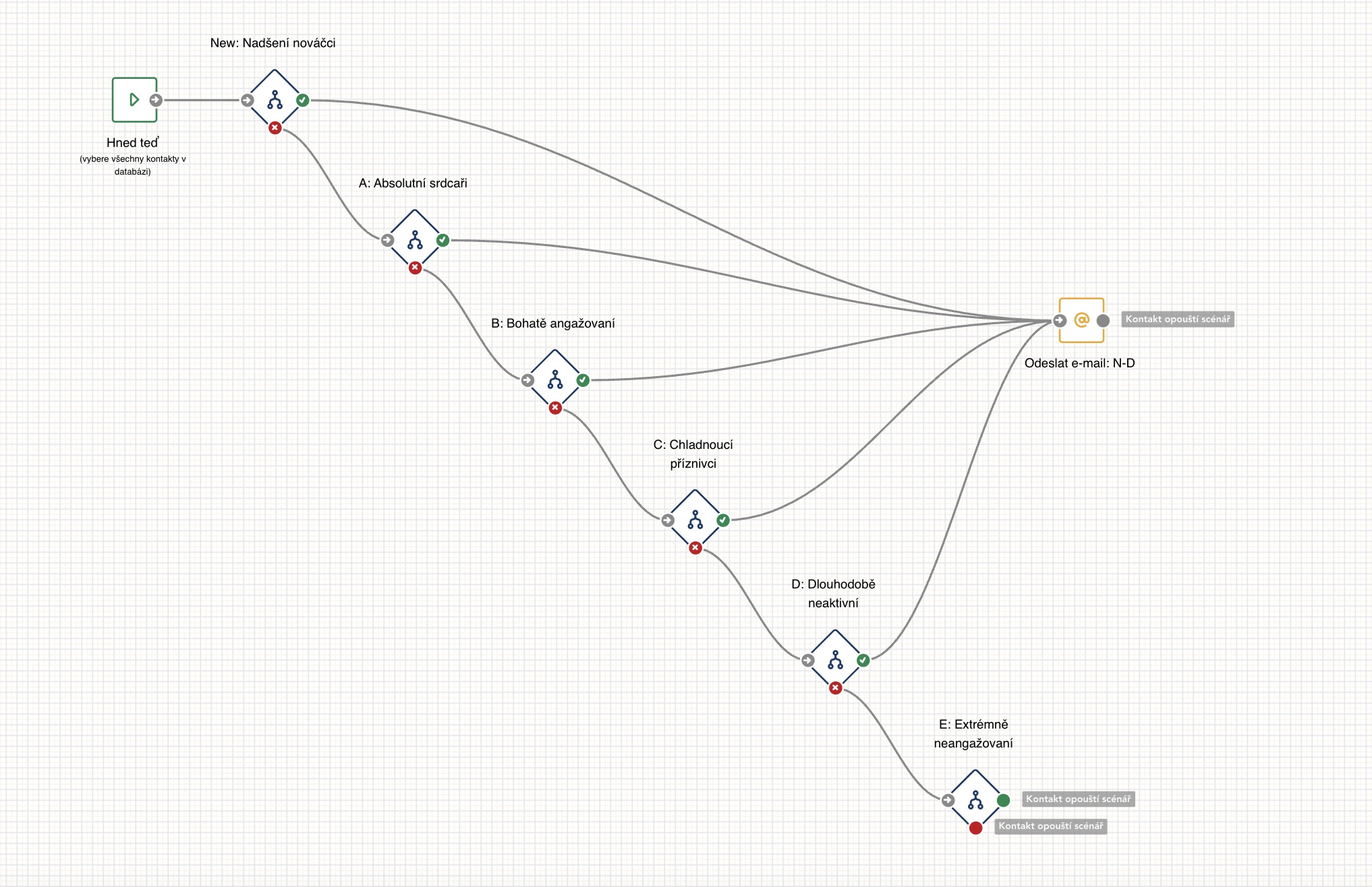 Na pracovní ploše se vytvoří předpřipravený scénář, který rozdělí vaše kontakty do kategorií N–E (od nadšených nováčků po extrémně neangažované kontakty). Pomocí tohoto analyzačního scénáře si můžete rozdělit databázi svých kontaktů podle skóre.