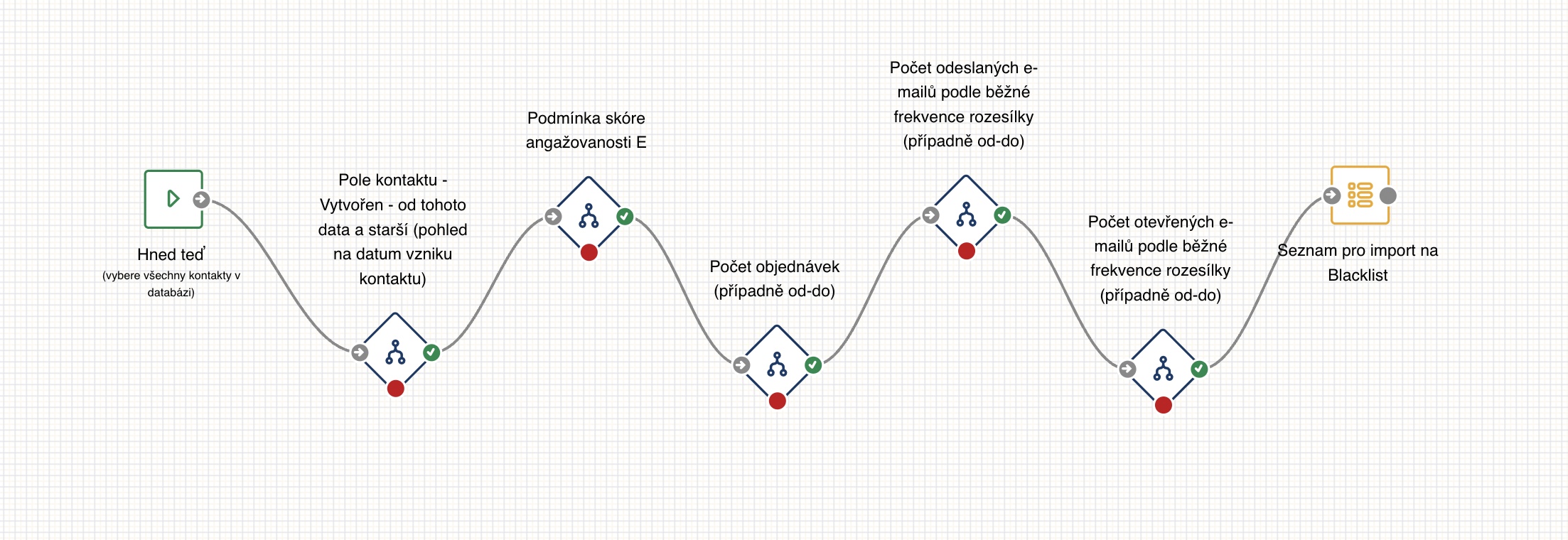 Můžete zvolit podmínky Pole kontaktu - Vytvořen (díváte se na stáří kontaktu), Počet objednávek (můžete si určit období vzniku objednávky), Počet odeslaných e-mailů (v závislosti na frekvenci rozesílek), v kotextu toho můžete použít podmínku na Počet otevřených e-mailů (opět v závislosti na frekvenci rozesílek).