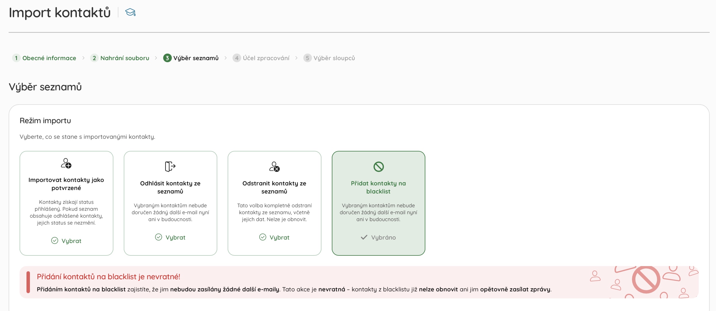 Přidáním kontaktů na blacklist zajistíte, že jim nebudou zasílány žádné další e-maily. Tato akce je nevratná – kontakty z blacklistu již nelze obnovit ani jim opětovně zasílat zprávy.