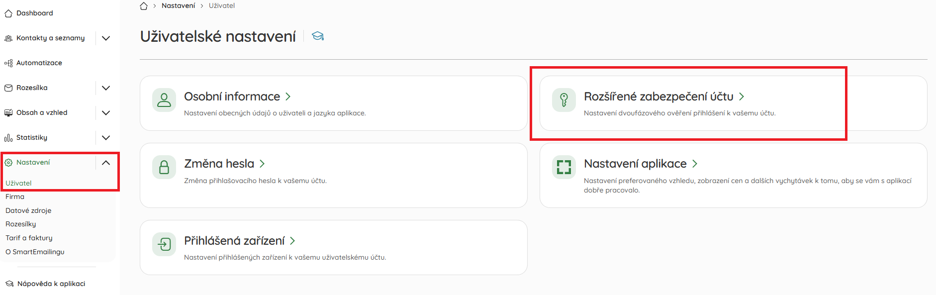Možnost nastavení dvoufázového ověření přihlášení naleznete pod svým účtem, konkrétně v části Nastavení → Uživatel → Rozšířené zabezpečení účtu.