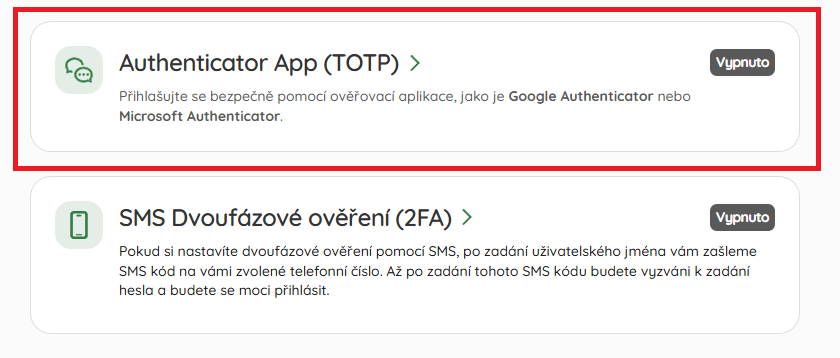 Nastavení dvoufázového ověření přihlášení pomocí autentizačního kódu, naleznete v části Nastavení → Uživatel → Rozšířené zabezpečení účtu → Authenticator App (TOTP).