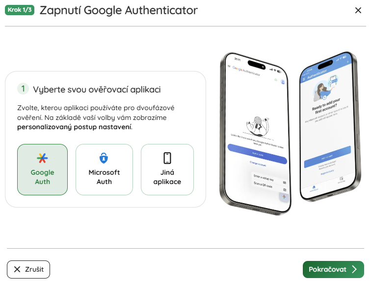 Zvolte aplikaci, kterou chcete používat pro ověřování. Nejčastěji se používá Google Authenticator, Microsoft Authenticator nebo jiná aplikace podporující TOTP.