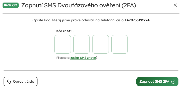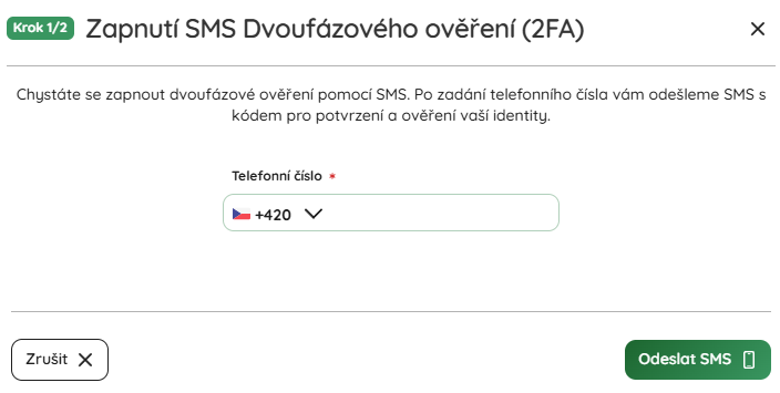 Nastavení dvoufázového ověření přihlášení pomocí SMS kódu, naleznete v části Nastavení → Uživatel → Rozšířené zabezpečení účtu → SMS Dvoufázové ověření (2FA).