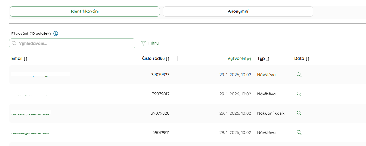 Lze si vyhledat identifikované i anonymní návštěvy. Pokud chcete zjistit více detailů, stačí kliknout na ikonu lupy ve sloupci Data.