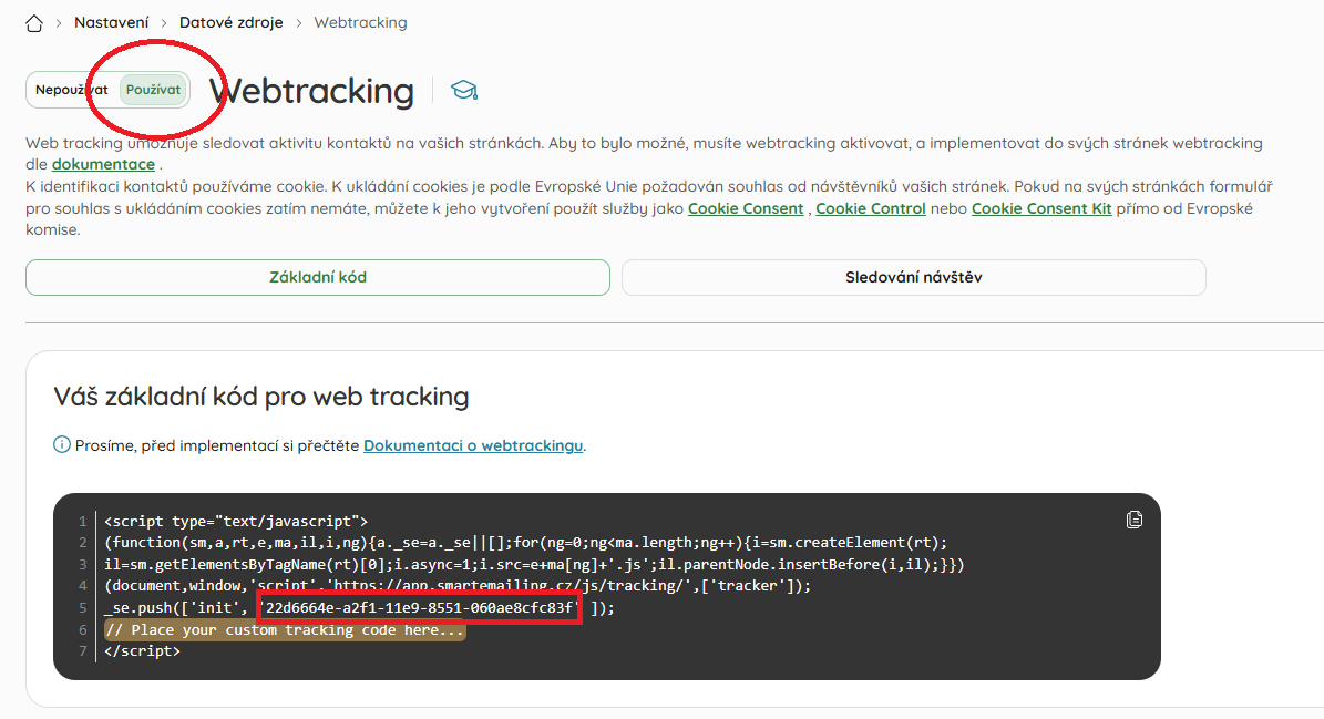 Možnost aktivace webtrackingu naleznete v části Nastavení → Datové zdroje → Webtracking. Ujistěte se, že je zaškrtnuta možnost Používat. V poli "Váš základní kód pro web tracking" pak vyhledejte řetězec init. Tento ID řetězec je váš Webtracking key.