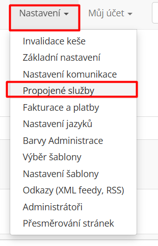 Přihlašte se do administrace svého ShopFocusu a v horním menu klikněte na Nastavení. Z rozbalovací nabídky pak vyberte Propojené služby.