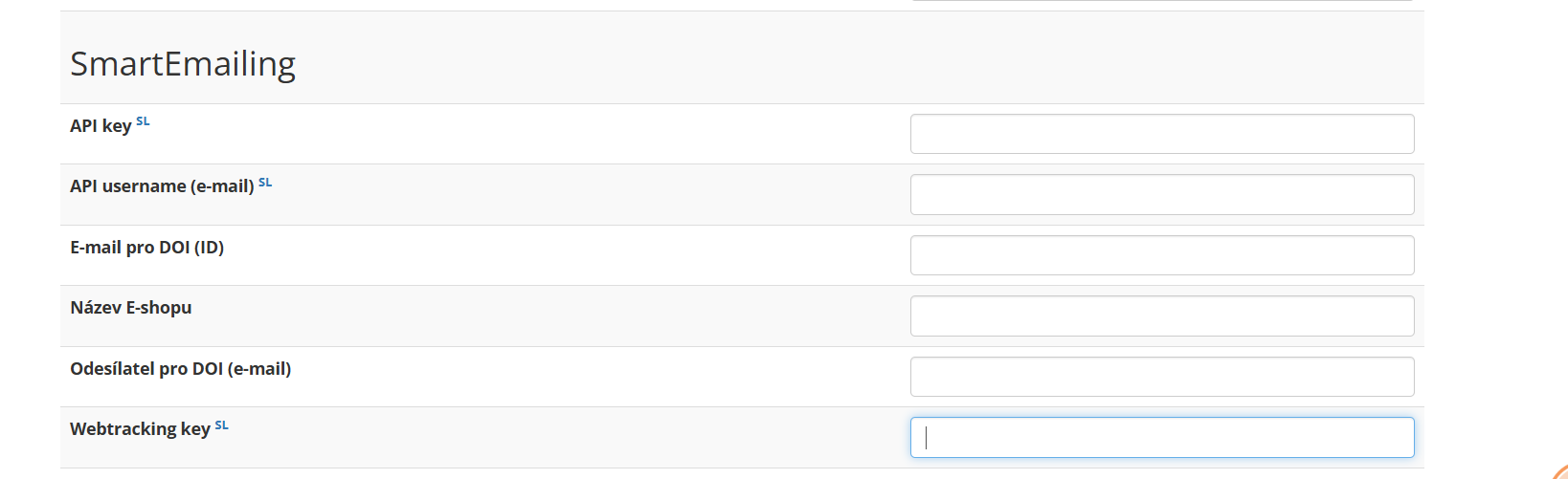 Na této stránce najdete sekci SmartEmailing, kam je potřeba vložit data, jejichž získání jsme si popsali v předchozí části.