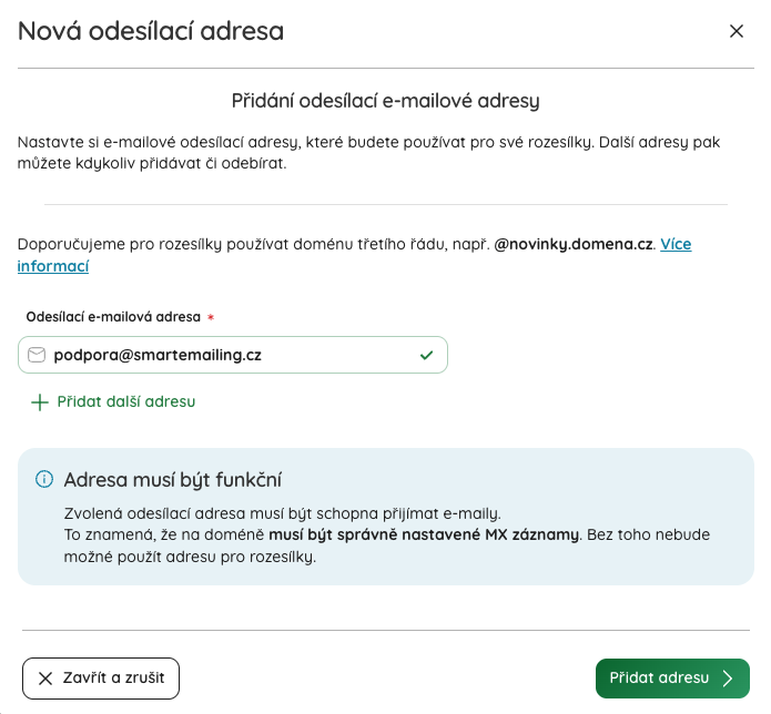 Pokud chcete odesílat e-maily poprvé nebo přidat novou odesílací adresu, je potřeba ji nejdříve autorizovat a nastavit DNS záznamy pro doménu, která je součástí adresy. Teprve potom se adresa objeví v nabídce odesílacích adres (a adres pro odpovědi).