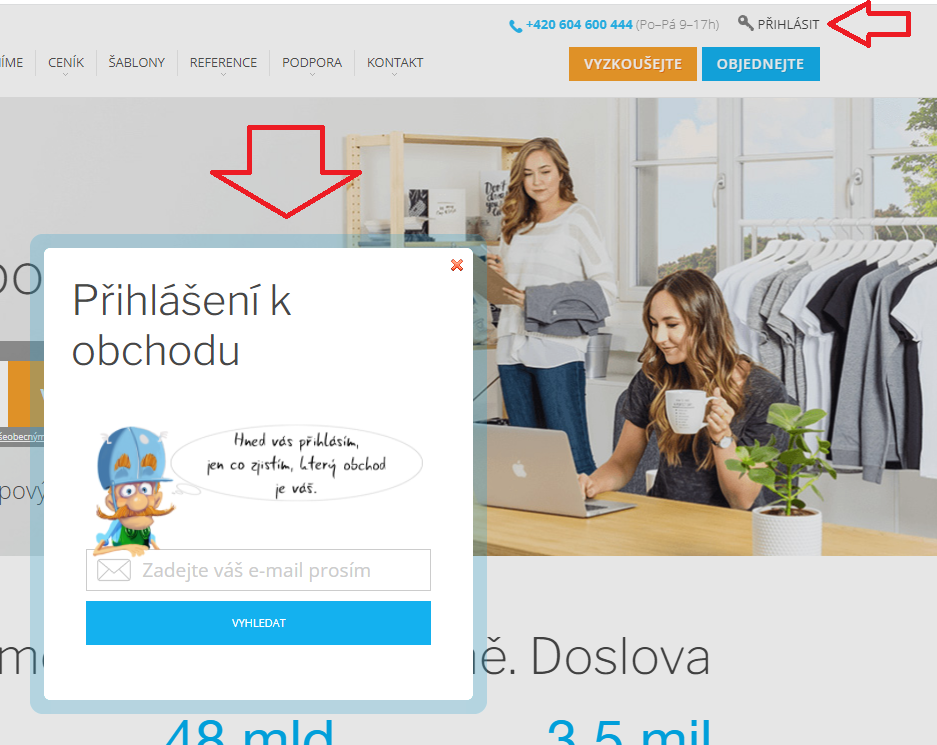 Zákaznickou administraci naleznete na adrese www.shoptet.cz vpravo nahoře, kde je potřeba vyplnit přihlašovací jméno a heslo.