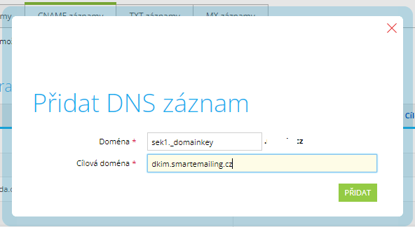 DNS záznamy se nastavují v administraci domény vaší odesílací adresy. Nejprve je nutné tuto adresu přidat do SmartEmailingu (Nastavení → Rozesílky → Odesílací adresy) a následně ji ověřit. Po ověření adresy (pomocí ověřovacího e-mailu, který vám přijde) budete moci pokračovat s nastavením DNS záznamů. Správný formát záznamů naleznete v sekci Nastavení → Rozesílky → DNS záznamy.