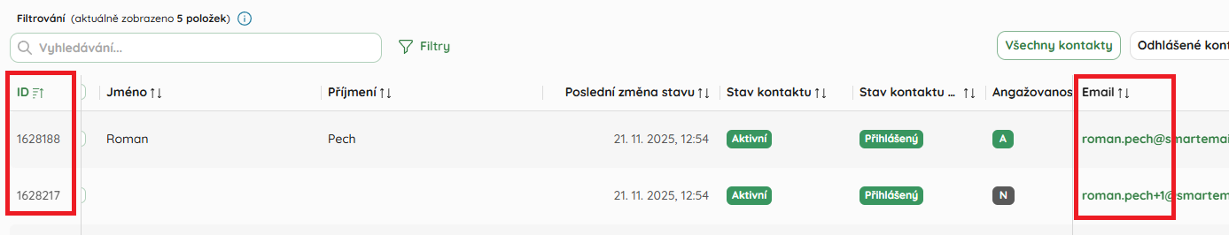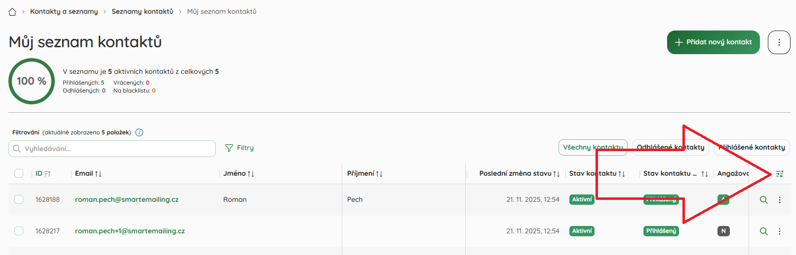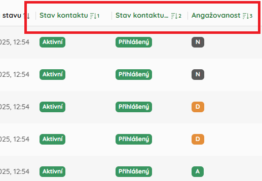 Potřebuji seřadit kontakty tak, aby byly aktivní a zároveň v daném seznamu přihlášené. Rád bych je ale také seřadil podle jejich angažovanosti. Kliknu tedy nejdříve na řazení sloupce Stav kontaktu, poté sloupce Stav kontaktu v seznamu a nakonec na řazení sloupce Angažovanost.