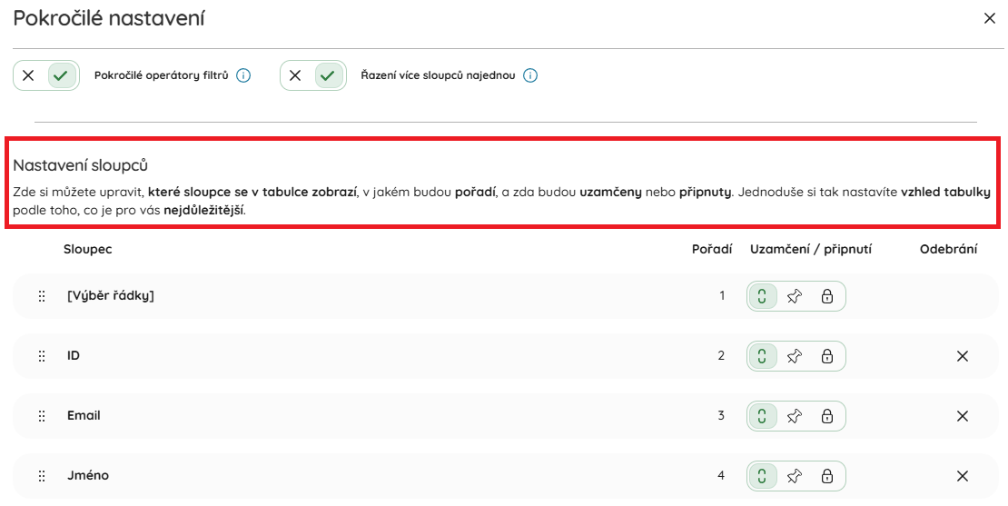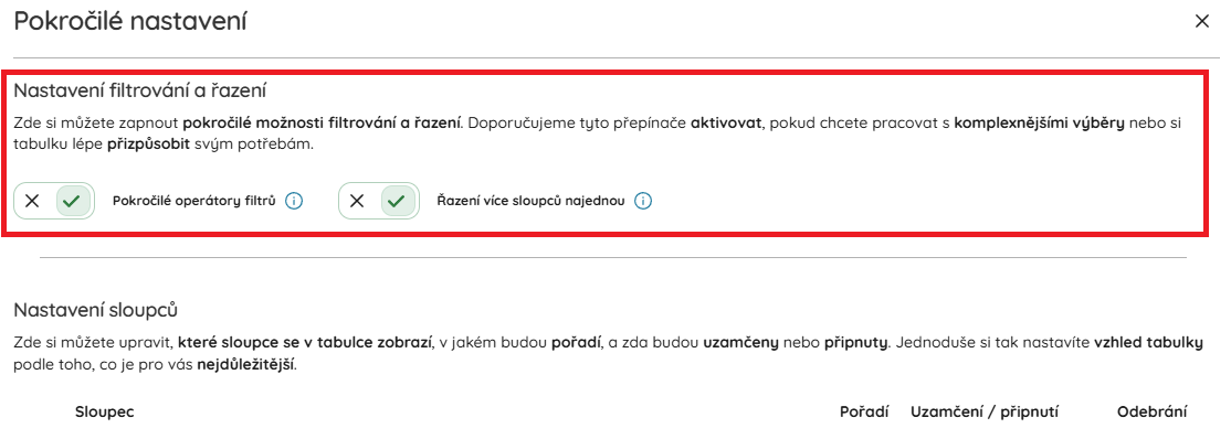 V horní části naleznete možnost povolit či zakázat Pokročilé operátory filtrů a Řazení více sloupců najednou.