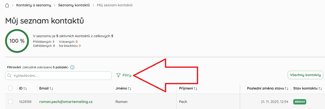 Všechny kontakty naleznete v části Kontakty a seznamy → Kontakty, dostupné seznamy kontaktů pak naleznete v části Kontakty a seznamy → Seznamy kontaktů. Pokud chcete nastavit pokročilá nastavení či filtry v rámci seznamu kontaktů, je potřeba vybraný seznam nejdříve rozkliknout.