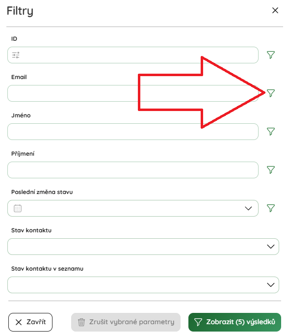 Filtry kontaktů slouží k jejich třídění na základě nastavených kritérií (např. ID, stavu, angažovanosti nebo obsahu jednotlivých polí). do nastavení filtrování se dostanete po kliknutí na ikonu fitru vedle políčka Vyhledávání.
