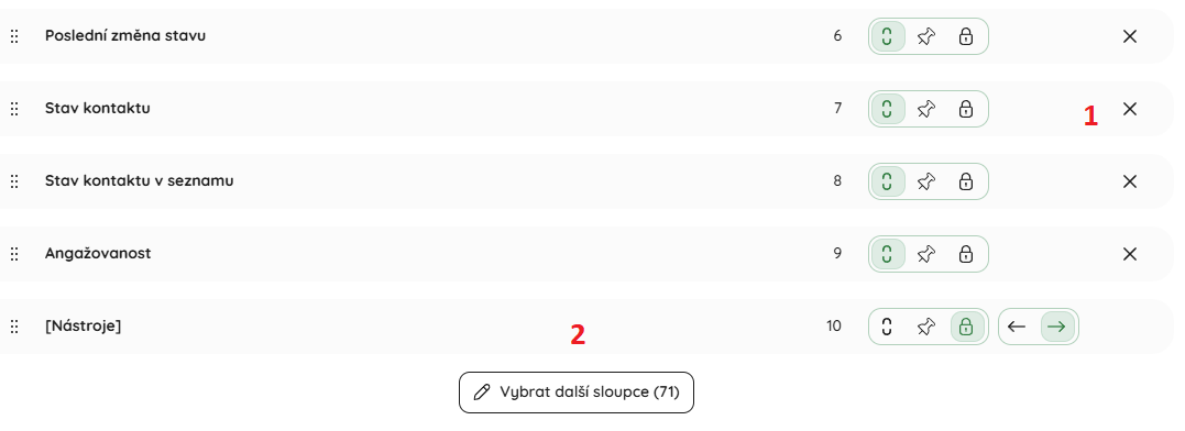 Pokud některý sloupec ve výběru vůbec nechcete, můžete jej odstranit pomocí křížku úplně vpravo na řádku (1) a naopak, pokud některý sloupec postrádáte, lze jej do výběru přidat pomocí tlačítka umístěného úplně dole (2).
