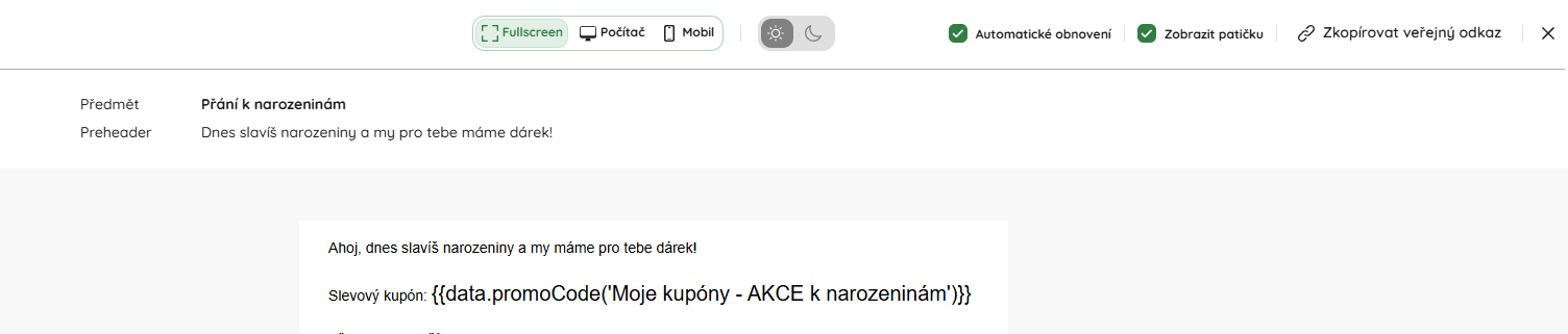Nicméně si zde můžete překontrolovat, zda váš e-mail obsahuje správný předmět a také preheader. Dále si vyzkoušet jeho zobrazení na PC a mobilu, či ve světlém nebo tmavém režimu. Pokud potřebujete na e-mail kdekoliv odkazovat, bude pro vás také užitečná možnost Zkopírovat veřejný odkaz.