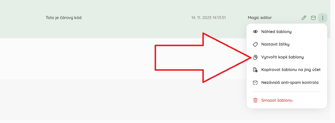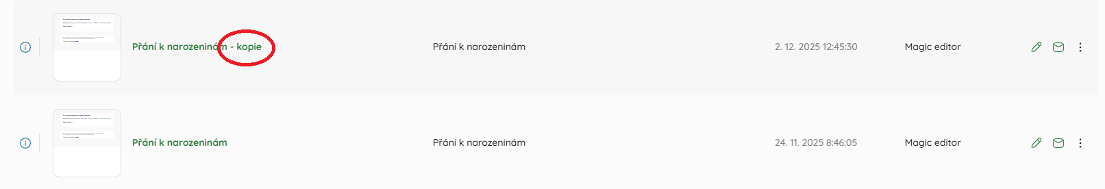 Po kliknutí na tuto možnost se vytvoří kopie dané šablony, která je s ní naprosto totožná, včetně nastavení předmětu a preheaderu. Pouze k názvu nové šablony je přidáno - kopie.