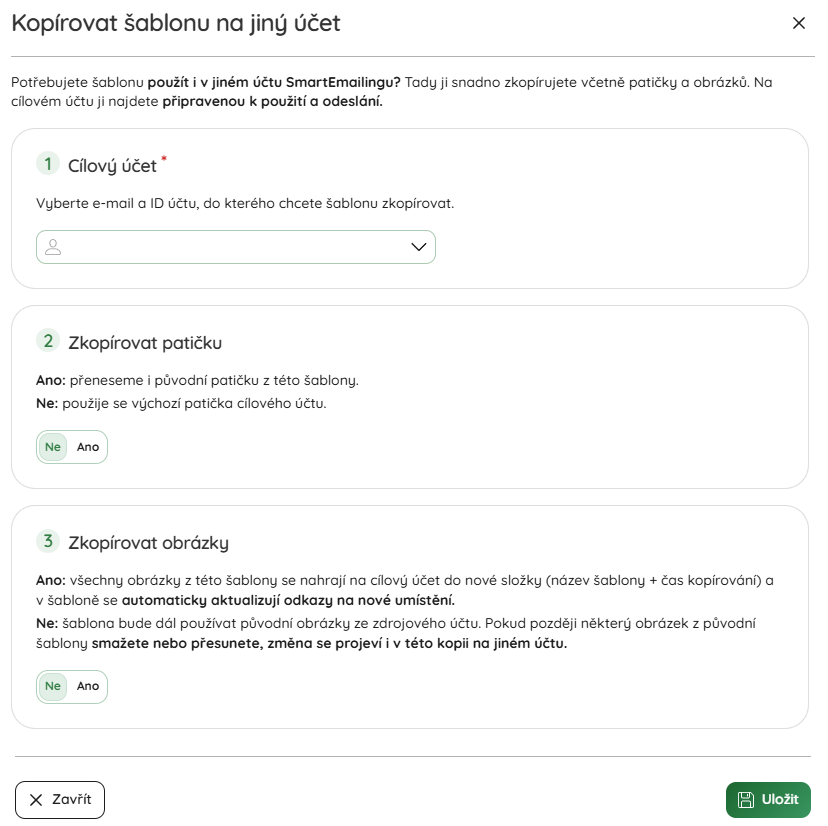 2) Zkopírovat patičku - pokud chcete zkopírovat i aktuální patičku dané šablony, pak zvolte Ano. V opačném případě bude použita výchozí patička cílového účtu.