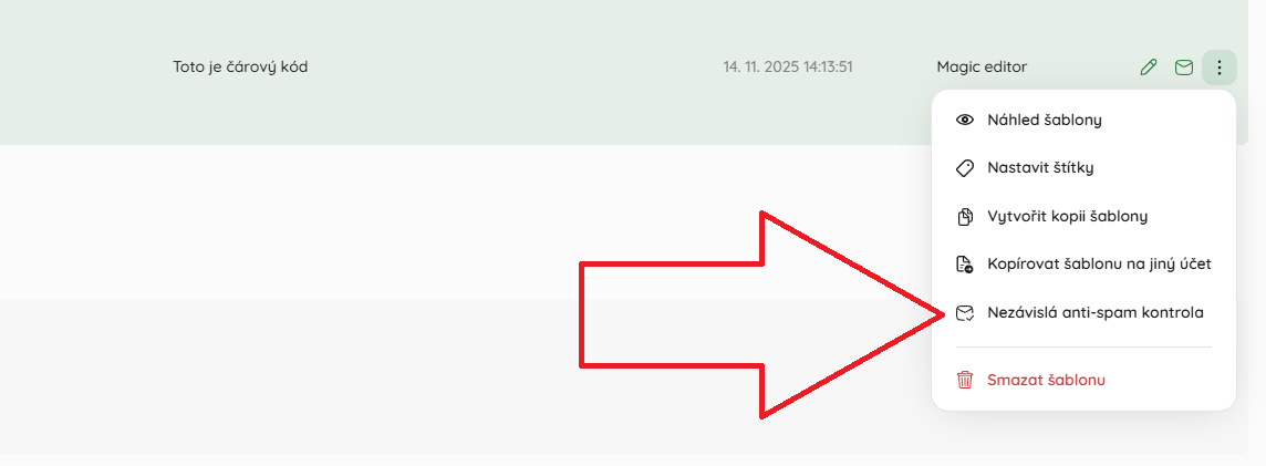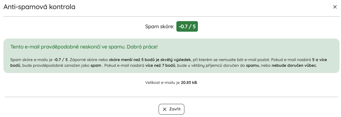 Šablonu můžete prověřit pomocí nezávislé anti-spamové kontroly. Díky tomu s předstihem zjistíte, zda bude váš e-mail dobře hodnocen i v rámci antispamových filtrů serverů, na které zasíláte.