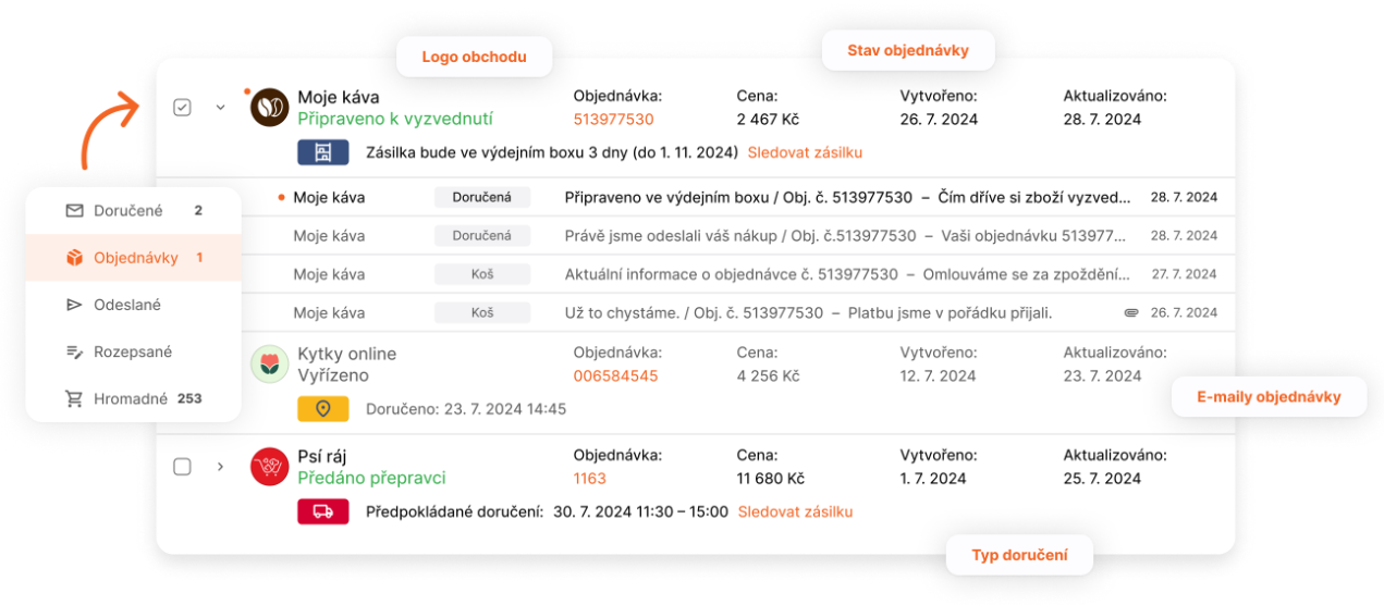 - Zviditelnění v inboxu: Zobrazení loga, stavu objednávky a tlačítka pro sledování zásilky přímo v seznamu zpráv.
