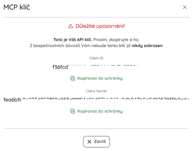 Vygeneruje se API klíč, sestávající z Client ID a Client Secret.