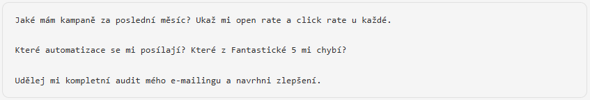 MCP (Model Context Protocol) je technologie, která umožňuje propojit AI asistenta s vašimi nástroji a daty. Díky tomuto propojení může AI přímo pracovat s daty z vašich emailových kampaní – bez nutnosti exportů nebo ručního zadávání.