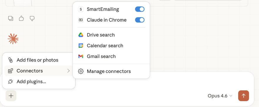 V chatovacím okně klikněte na ikonu + (plus) vlevo dole pod textovým polem. V menu vyberte Connectors - zobrazí se seznam vašich connectorů s přepínači. Zapněte SmartEmailing pro aktuální chat. Connector můžete kdykoli vypnout a znovu zapnout — máte tak plnou kontrolu nad tím, kdy Claude přistupuje k vašim datům.