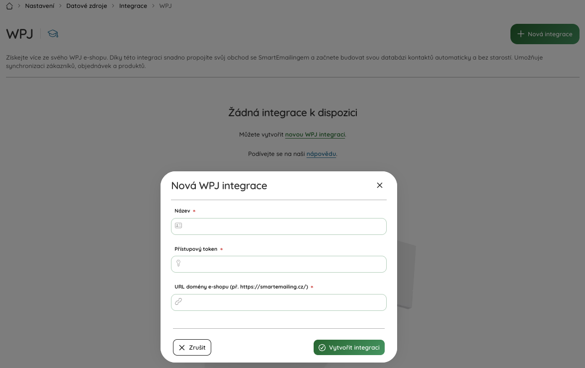 Nyní se prosím přihlaste ke svému účtu ve SmartEmailingu, případně si založte nový a přejděte do nastavení WPJ integrace, kde jen kliknete na tlačítko Nová integrace.