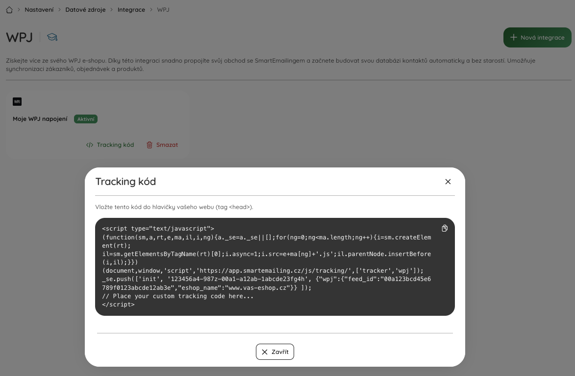 Po kliknutí na tlačítko se vám otevře nové okno, kde máte připravený kód pro sledování aktivity zákazníky - tento kód prosím vložte do hlavičky vašeho e-shopu u WPJ nebo např. do Google Tag Manageru (GTM), pokud jej máte s e-shopem propojený.